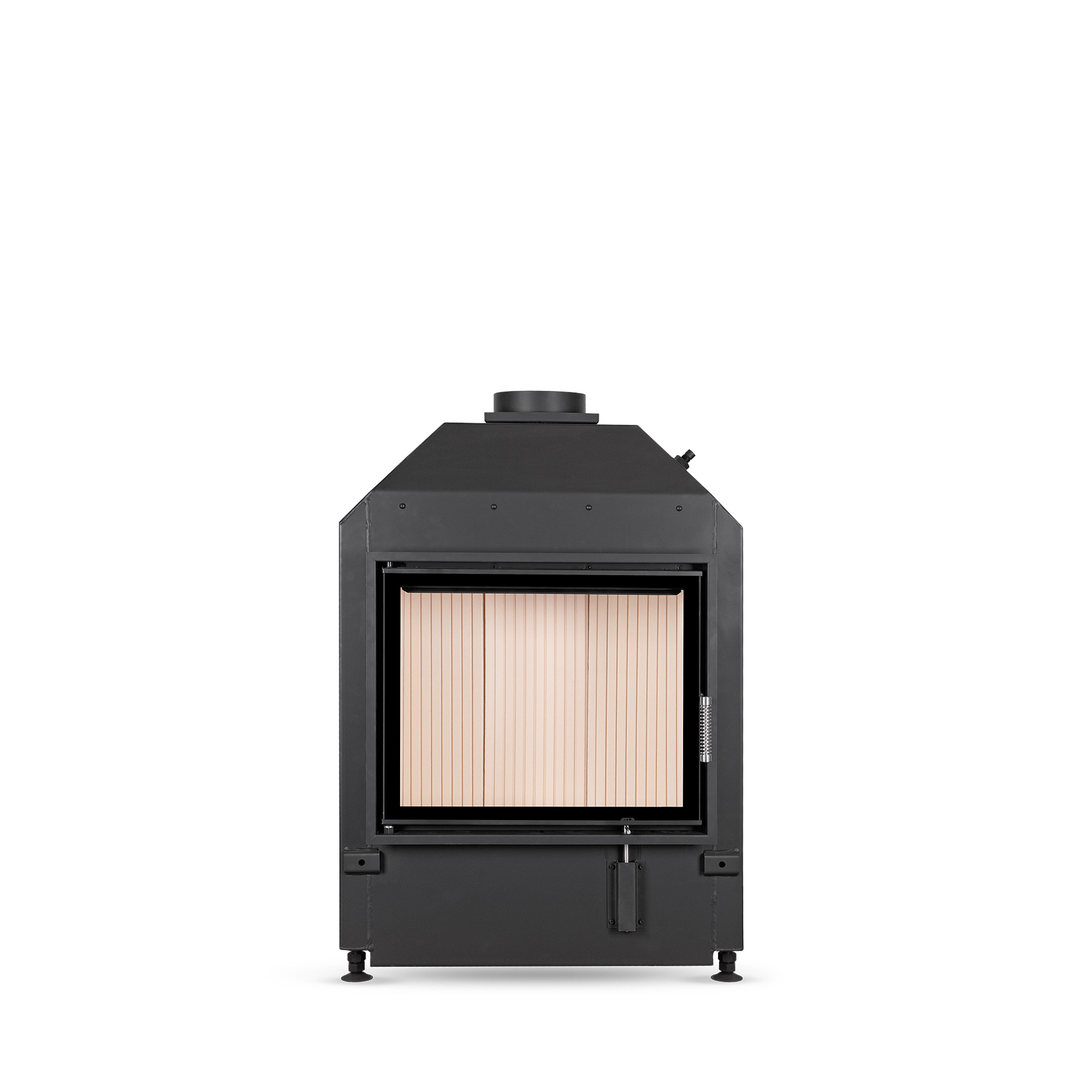 Väikese paigaldussügavusega kaminasüdamik. Paremale või vasakule avaneva uksega. Kaminasüdamikku on võimalik tellida ka tumeda šamottvoodriga.