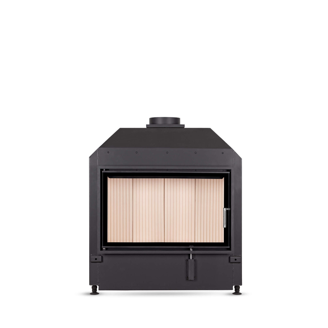 Väikese paigaldussügavusega kaminasüdamik. Paremale või vasakule avaneva uksega. Kaminasüdamikku on võimalik tellida ka tumeda šamottvoodriga.