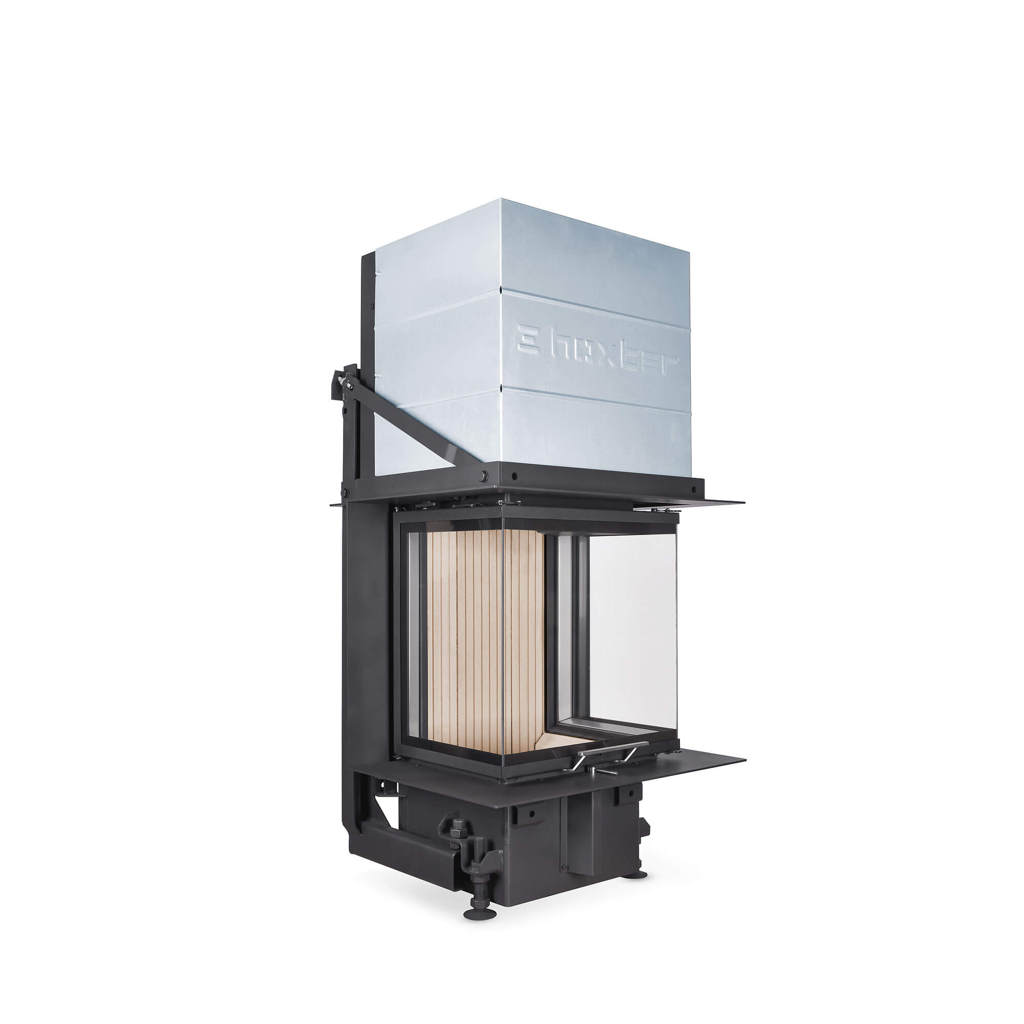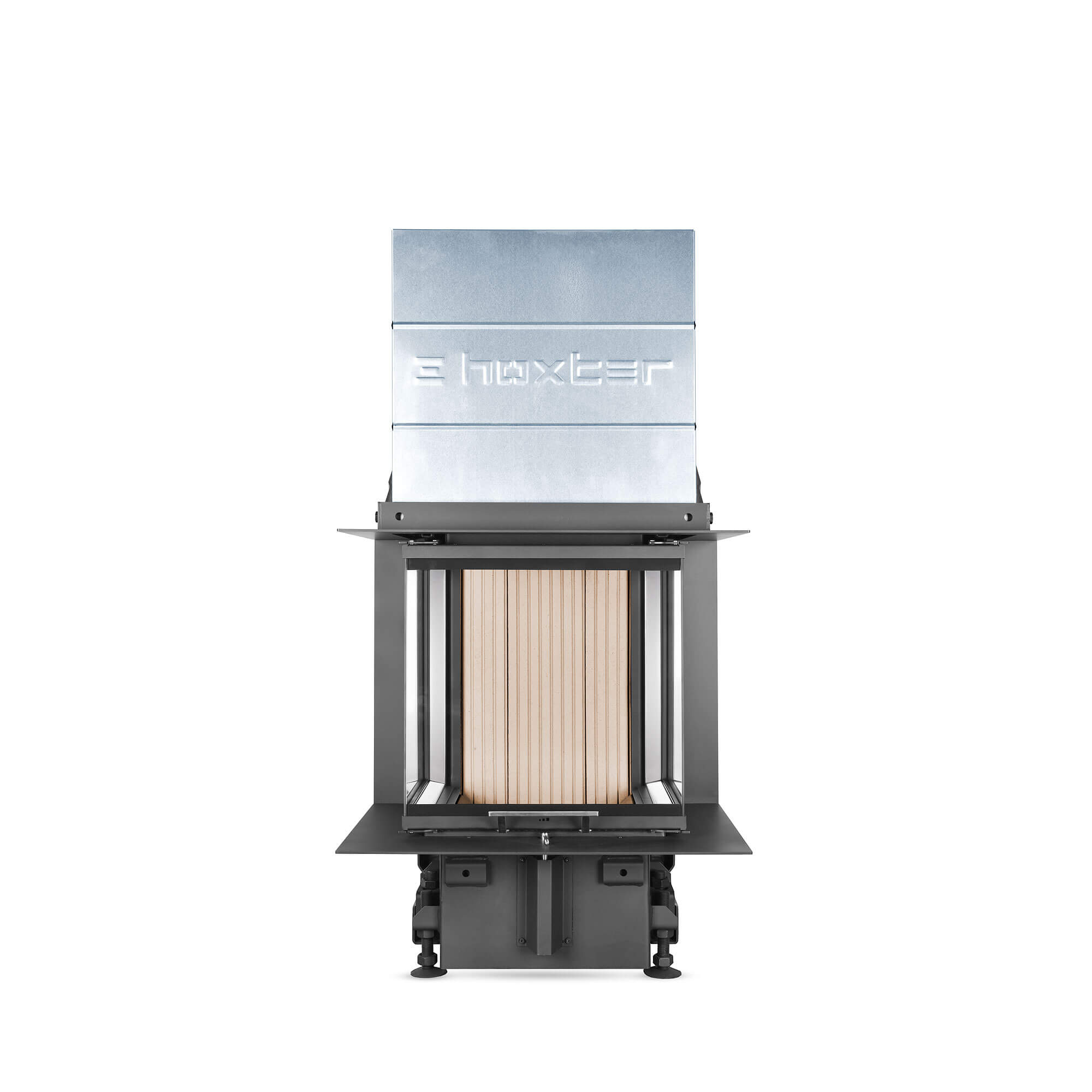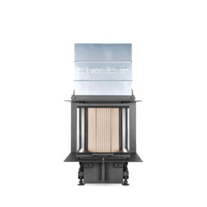 Kolmest küljest vaadeldav väikese paigaldussügavusega kaminasüdamik Hoxter UKA 35/45/35/50Sh. Tõstetava uksega. Kõik tõstetavad uksed on tellitavad ka eemaldatava käepidemega, et miski ei segaks vaadet tulele.
